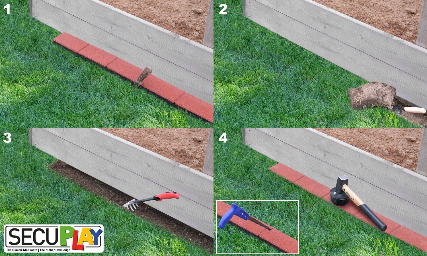 Die Verlegung der SECUPLAY Gummi-Mähkante ist sowohl bei Neuanlage der Garten-/Spielfläche, als auch bei nachträglichem Einbau äußerst einfach. An der entsprechenden Stelle einen 10cm breiten (für XL 20cm), ca. 3,6cm tiefen Graben herstellen (Bestandsrasen vorher mit Messer abschneiden), Untergrund etwas auflockern, SECUPLAY Gummi-Mähkante einsetzen und mit einem Gummihammer festklopfen. Schnitte können bei Bedarf mit einer normalen Holz-Handsäge durchgeführt werden.