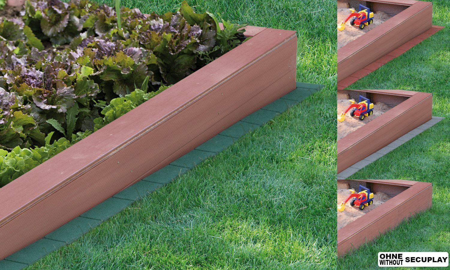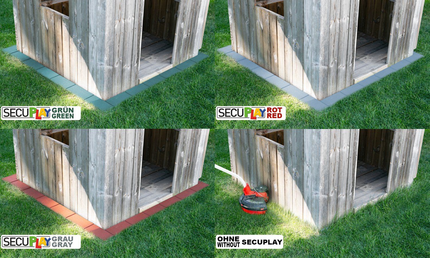 Entwickelt wurde die SECUPLAY Gummi-Mähkante als Lösung einer bekannten Problematik. Grenzt beispielsweise ein Hochbeet, Spielturm, Sandkasten, Gartenhaus, Zaun oder eine Holz-/WPC-Terrasse ohne Mähkante an den Rasen, schneiden meist weder Rasenmäher, noch Mähroboter randlos bis zum Objekt. Der Rasentrimmer erscheint zwar hier als einfache Lösung, wer aber den Randbereich trimmt, beschädigt schnell das angrenzende Material oder dessen Oberfläche. Als Alternative zur SECUPLAY Gummi-Mähkante kämen herkömmliche Mähkanten aus Betonsteinen in Frage. Jedoch müssen diese meist in Beton gesetzt und verfugt werden. Im Gegensatz zum Betonstein speichert die SECUPLAY Gummi-Mähkante kein Wasser und bietet deshalb eine Verwitterungsvorbeugung angrenzender Objekte. Im Vergleich zum Trimmen erspart man sich nicht nur das Risiko der Beschädigung des angrenzenden Objekts, sondern auch den Arbeitsschritt an sich.